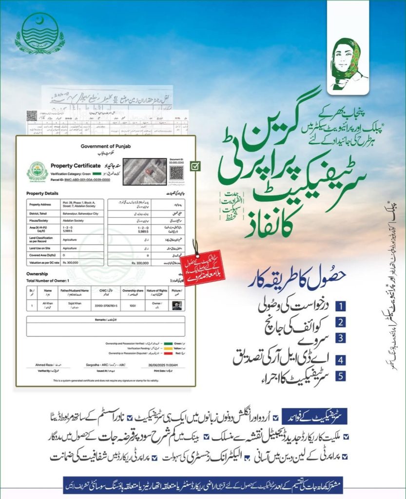 Under the leadership of CM Punjab Maryam Nawaz Sharif, the Punjab government has taken a revolutionary step to address serious problems in the property sector: the Green Property Certificate. This Green Property Certificate has been launched as a pilot project in Sialkot, and it will gradually be available across the Punjab to make the property system transparent, secure, and fraud-free.