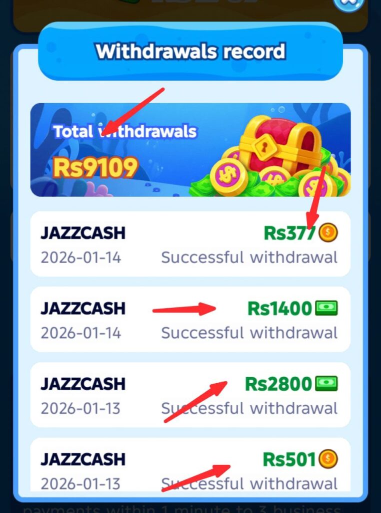 Step 3: After adding your EasyPaisa or JazzCash account, select the withdrawal amount. The minimum withdrawal amount is 1400 rupees. You can earn the rupess by playing the game or by inviting your friends to play.